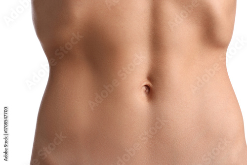 Woman with flat belly on white background, closeup