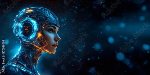 Woman with futuristic helmet and neon circuit design. Cyberpunk portrait for future technology illustration, artificial intelligence, network communication concept, technology