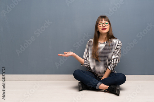 Woman with glasses sitting on the floor presenting an idea while looking smiling towards