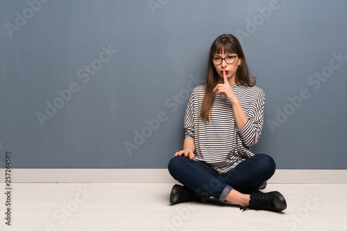 Woman with glasses sitting on the floor showing a sign of silence gesture putting finger in mouth