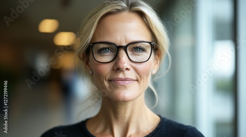 Woman with glasses standing indoors and smiling near large windows
