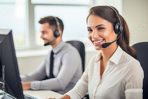 Woman with headphones and microphone at computer, customer service. Concepts of customer support, help, call center.