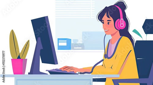 Woman with Headphones Working on a Computer in a Bright Office