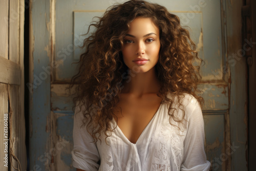 Woman with long brown hair is wearing white shirt