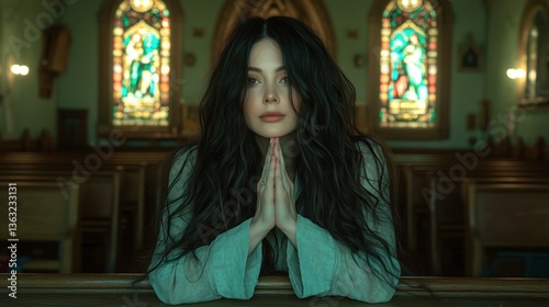 woman with long, dark hair sits in a historic church, hands clasped together in prayer. Sunlight filters through colorful stained glass, casting vibrant reflections on her serene face