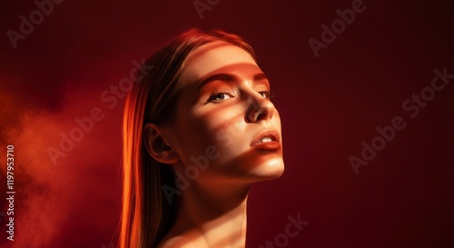 Woman with long hair and a red background