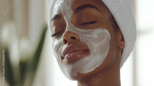 Woman with mask. Eyes closed. Peaceful, calm, relaxing. White towel on head
