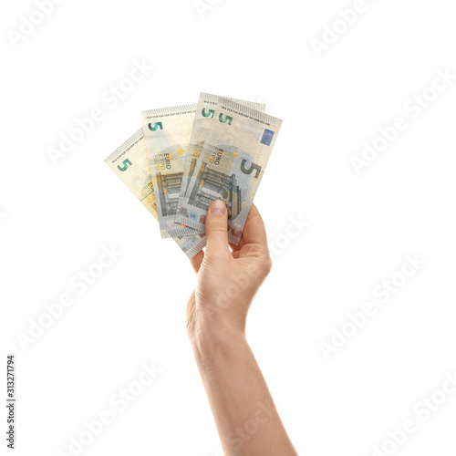 Woman with money on white background, closeup