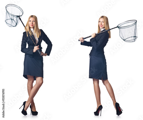 Woman with net isolated on white
