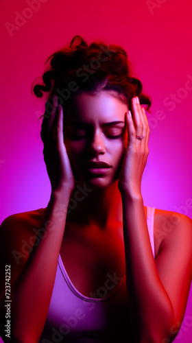 Woman with of pain, hands pressed to her temples, is depicted against background of intense red light, conveying the agony of severe headache or migraine. Struggling with stress. Neurological diseases