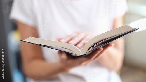 Woman with open paper book reading bestseller concept in bookstore