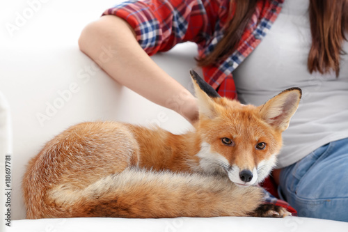 Woman with pet fox indoors, closeup