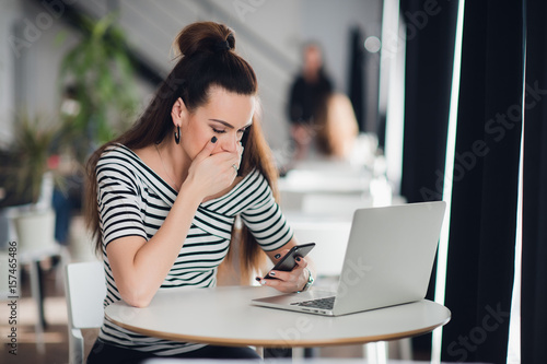 Woman with serious expression full of shock and perplexity is holding a smart phone while sitting in a cafe with a laptop.