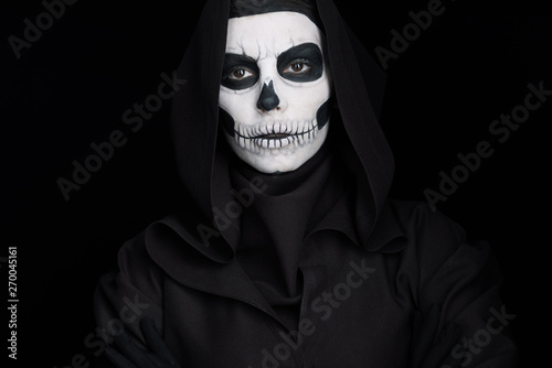 woman with skull makeup looking at camera isolated on black