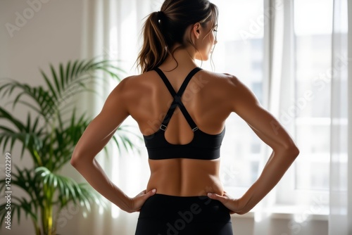 Woman with slim arms in black sports bra, black leggings, standing by large window, looking back over shoulder. Concept of fitness, slim arms, healthy diet in bright, airy room.