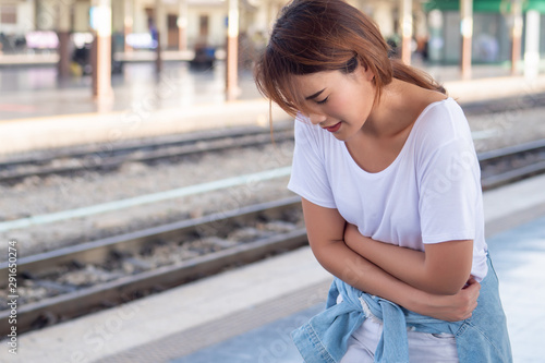 woman with stomach ache; sick woman suffering from stomachache, menstrual period cramp, abdominal pain, food poisoning, gastritis, acid reflux; asian young adult woman health care model