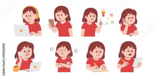 Woman with Various Activity, Gesture, and Pose. Woman Writing on Paper, Working with Laptop, Thinking, Has an Idea.
