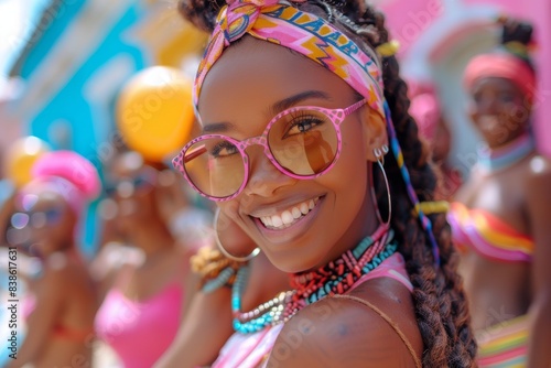 Woman with vibrant glasses and headscarf at outdoor festival
