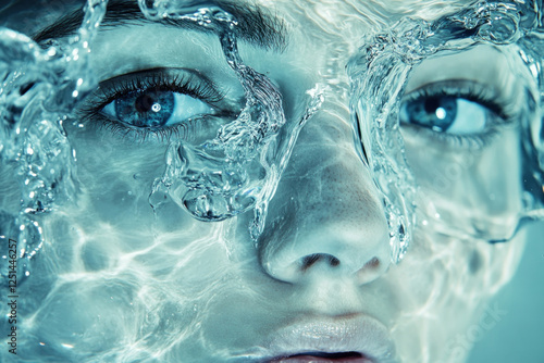 Woman with water on face, eyes closed, peaceful expression, sun filtering through trees in background.