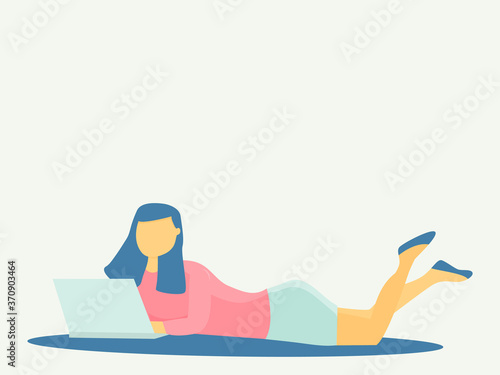 Woman working from home with her laptop. Employee vector illustration. Freelance cartoon. Banner with place for text.