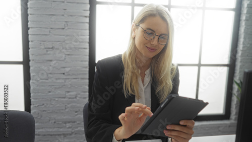 Woman working in office using tablet, blonde, wearing glasses, sitting at desk with modern interior and natural light from large windows, executive atmosphere captured.