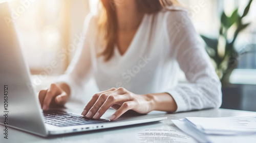 Woman working on laptop in bright workspace with greenery and natural light during day