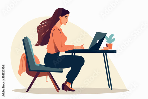 Woman working on laptop while sitting at table, bright colors, cartoon illustration, flat