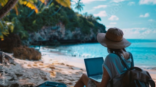 Woman Working Remotely on Tropical Beach, Workation