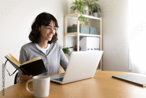 Woman working using laptop and notebook to organize and schedule business meetings.