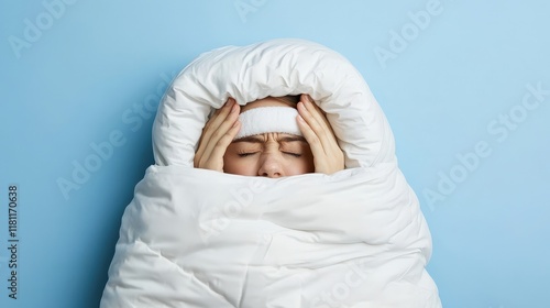 Woman Wrapped in Duvet, Cold Compress on Forehead, Experiencing Illness or Discomfort, Seeking Relief Under Blankets