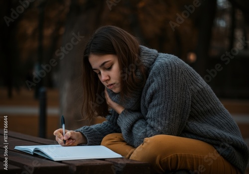 Woman Writing in Notebook Outdoors