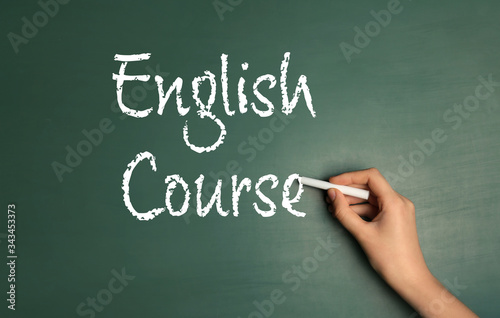 Woman writing words ENGLISH COURSE on chalkboard, closeup