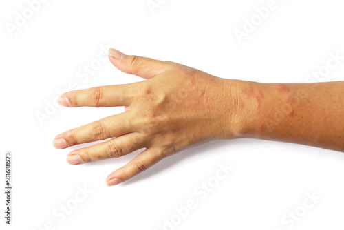 Woman's arm with red blisters on the skin due to allergic rash isolated on white background included clipping path.