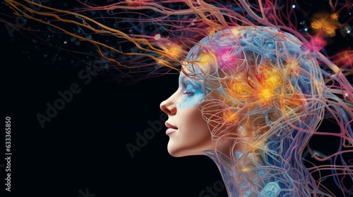 Woman's brain and nervous system pathways and nerve firing. AI generative.
