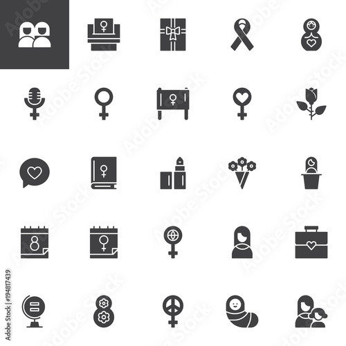Woman's day vector icons set, modern solid symbol collection, filled style pictogram pack. Signs logo illustration. Set includes icons as female, girl, mother, gender, sex, feminism, daughter, friends