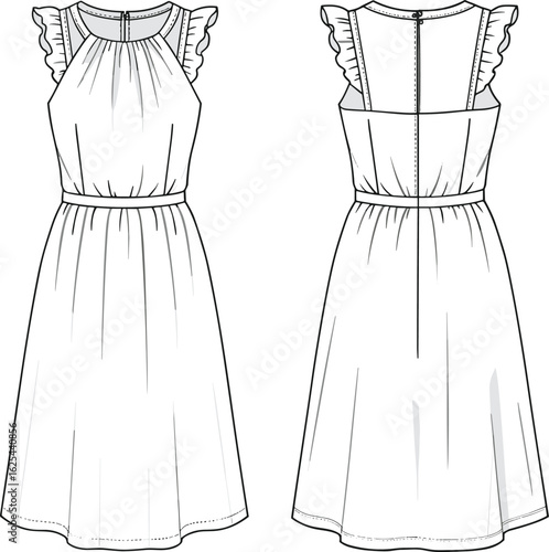 Woman's dress flat sketch, technical fashion drawing, vector template, apparel design, ruffle sleeve, gathered neck, back zipper, clothing mockup.