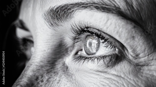 Woman's eyes, gazing, city reflection, black and white, close-up