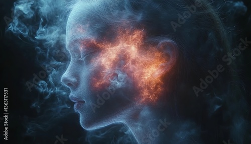 Womans face with fire, smoke, and abstract.