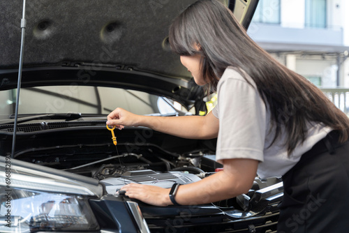 Woman's hand check engine oil A woman pulls out the dipstick to check the oil level of her car. A woman checks the engine oil in an old car parked in the garage before leaving.