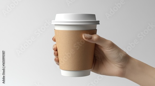 Woman's hand holding disposable coffee cup with blank cardboard sleeve on white background
