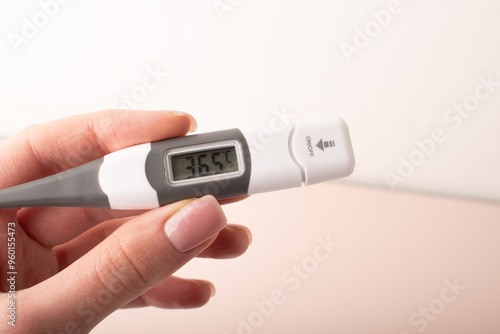 Womans hand holding thermometer that shows normal human temperature. Measuring body temperature. Health check. Health care concept. High quality photo