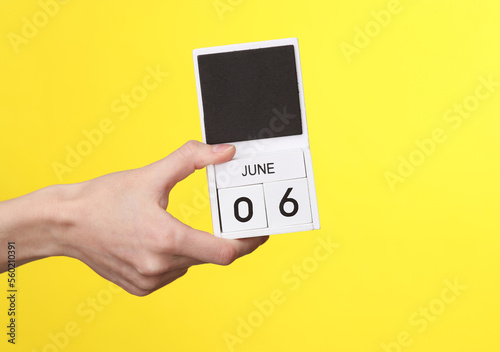 Woman's hand holds wooden calendar with date june 06 on a yellow background