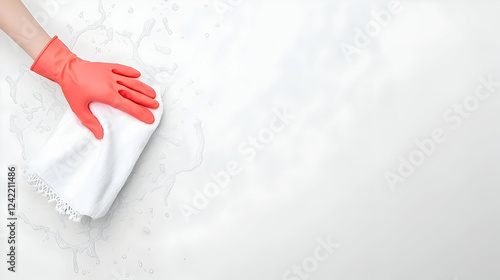 Woman's hand in glove wipes a white surface; water droplets; copy space