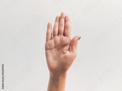 Woman's hand showing five tightly closed fingers on white background