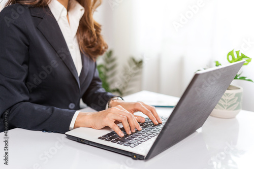 Woman's hand typing on laptop keyboard, businesswoman working in the office.