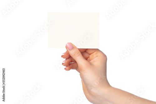 Woman's hand with blank white business card isolated on white