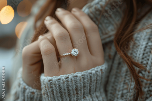 Woman's Hand With Diamond Engagement Ring Close-Up Cozy Knitted Sweater