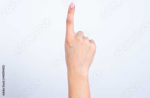Woman's hand with pink manicure over isolated white background pointing with fingers number one.