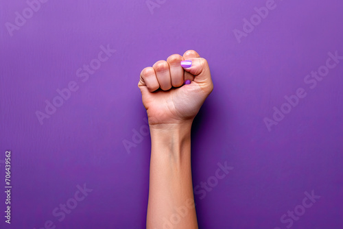 woman's hand with raised fist on purple background