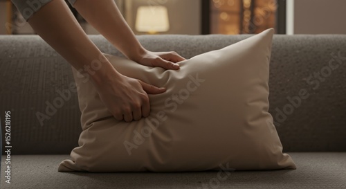 Woman's hands fluffing a soft beige decorative pillow on a grey sofa. Home interior and comfort concept. Living room decor.